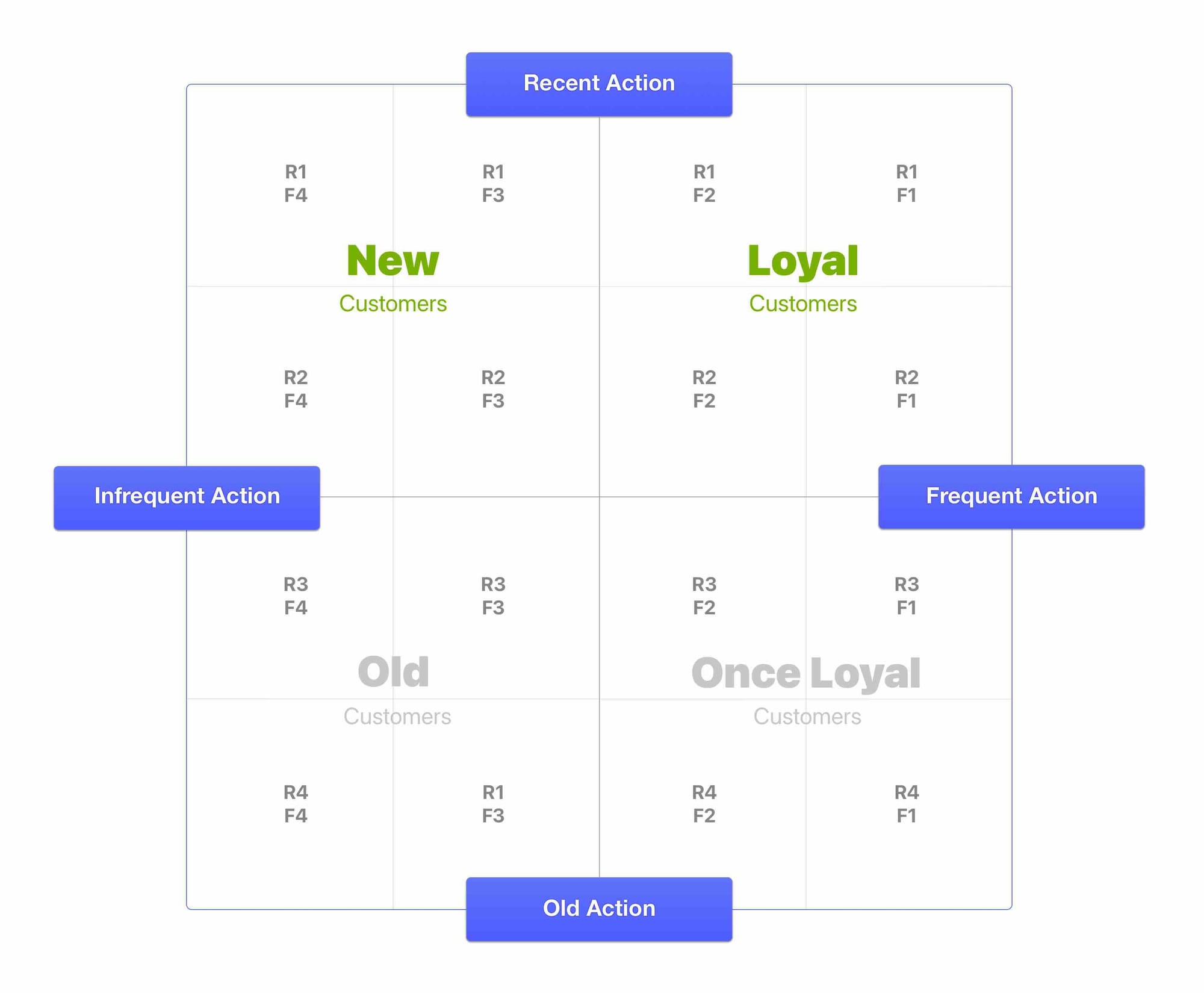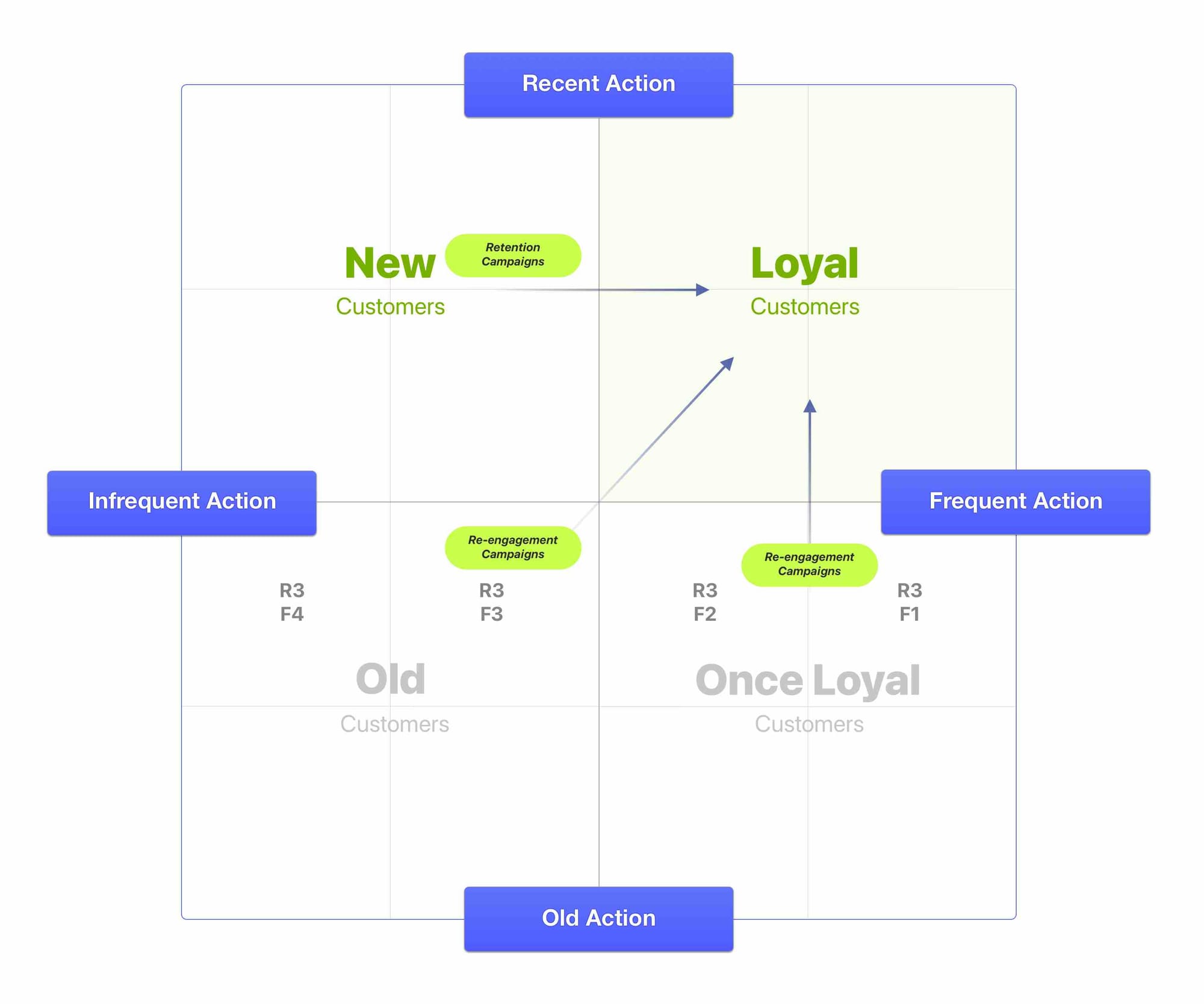 - Old Customers: Low-frequency, inactive customers (e.g., R4-F4). Strong incentives may be needed to rekindle their interest.
