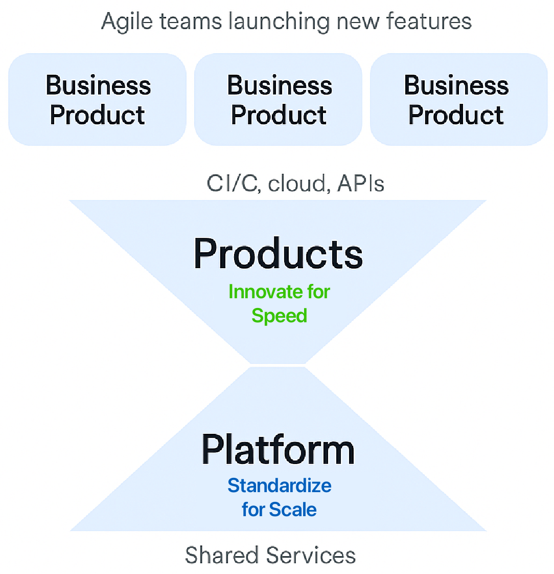 One powerful way to reconcile speed with the needs of a large enterprise is platform thinking. The basic idea is to create internal platforms – a set of shared services, APIs, and tools – that standardize the fundamentals (so you get economies of scale in those layers) while enabling fast innovation on top (economies of speed at the business layer).