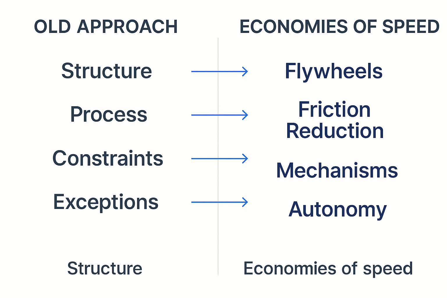 Crucially, optimizing for speed often requires breaking some old rules. Practices that maximize efficiency at scale – centralization, heavy reuse, strict standardization – can impede speed by adding friction or coordination cost. For example, in a scale world, reusing components and avoiding duplication is a virtue to reduce cost.