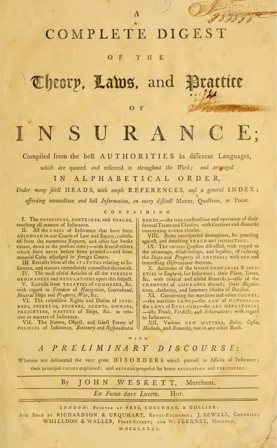 Came across this unique 1781 tome: A Complete Digest of the Theory, Laws, and Practice of Insurance by one John Weskett.